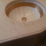 A Crema Marfil marble vanity with a previously visible nick that has now been expertly removed. The surface of the edge appears smooth and flawless, with no evidence of the previous nick. The area where the nick was more...