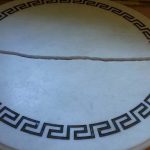 A Greek traditional meander border table displaying visible crack along its surface. The crack traverse the table, disrupting the intricate meander pattern that adorns its edges. Despite the damage, remnants of the more...