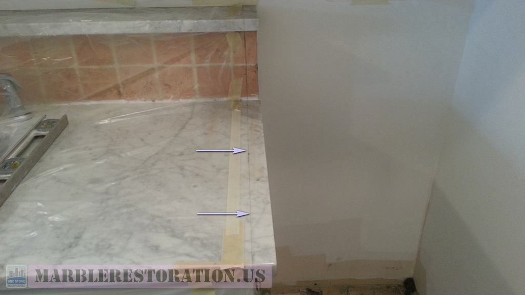 Cutline on the marble counter and tiled back splash before cutting to fit the new refrigerator.