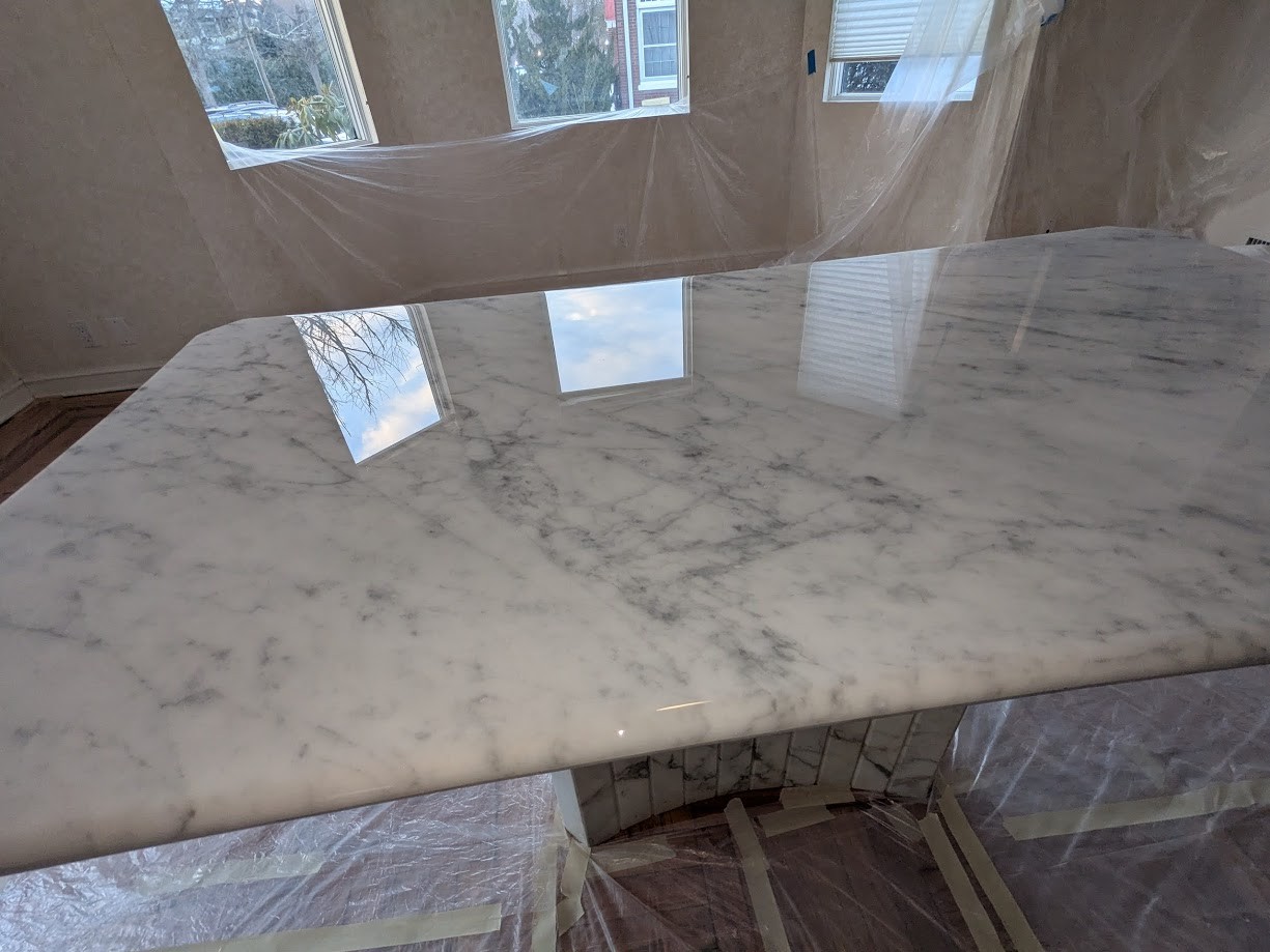 The finished product exhibits a high degree of specular reflection, transforming the table into a mirror that perfectly captures the surrounding architecture and landscape without distortion. By replacing the old, light-absorbing polyester with a modern, clear-pour epoxy, the refractive index of the surface is restored, allowing light to penetrate the stone and highlight the intricate veining of the marble beneath. This re-coating service not only returns the piece to its original aesthetic intent but also provides a durable, UV-stable finish that resists the yellowing that plagued the previous sealer.