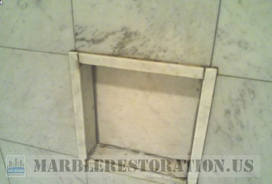 The shower niche had mold and yellow soapsuds. We replaced the old grout, changed the caulk, and clean the surface.