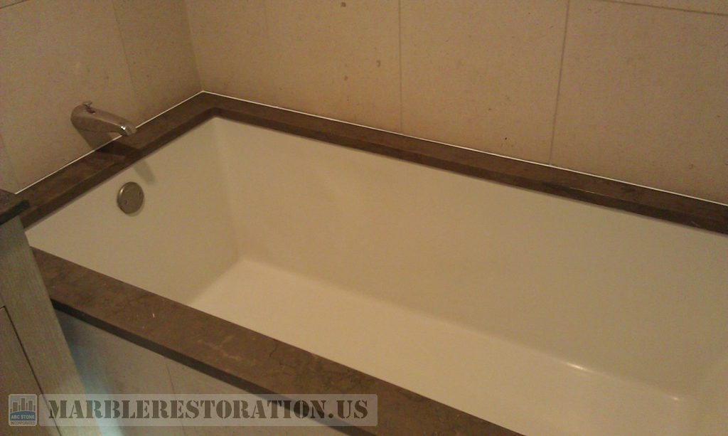 We restore this tub top by deep grinding, erosion holes patching, epoxy excess removal, polishing, sealing and caulking.