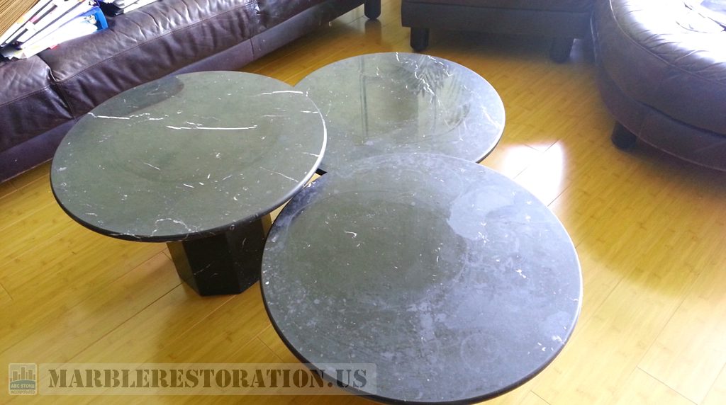 The appearance of whitish fogging spots on black marble tables could be due to a few possible causes: